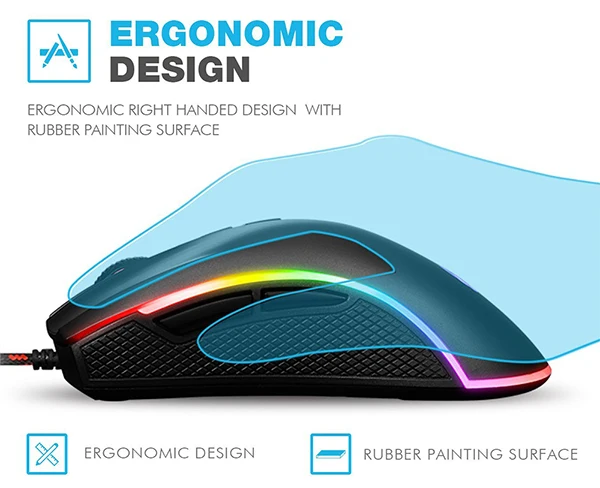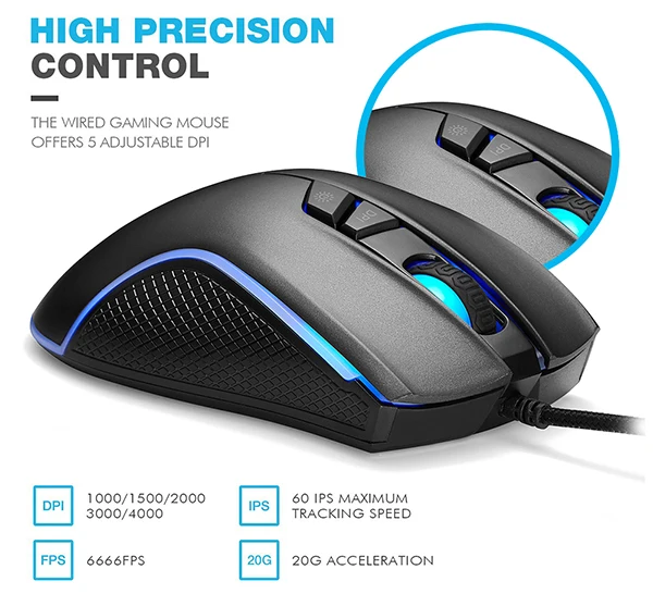 3.High precision control (AVAGO A3050 Sensor)with 5 adjustable DPI settings:1000/1500/2000/3000/4000,quickly adjustable for different gaming scenarios
