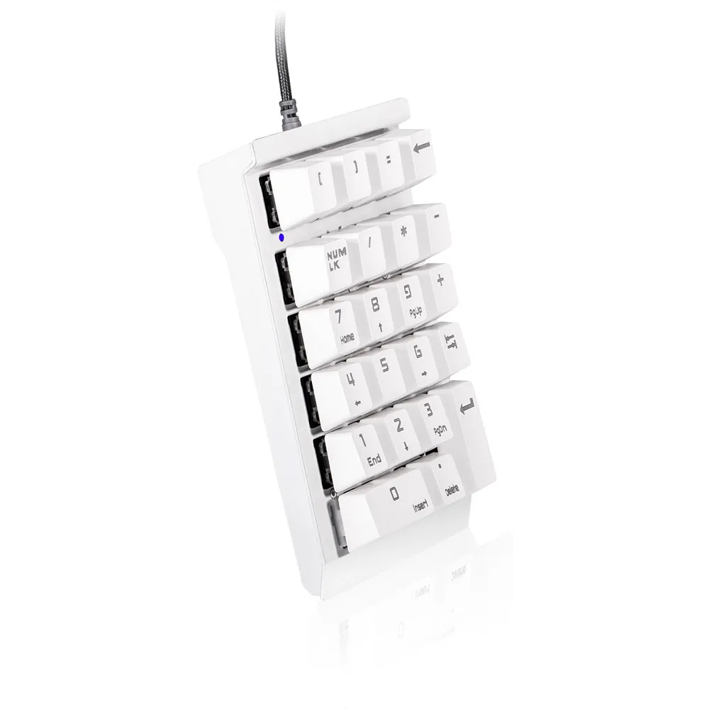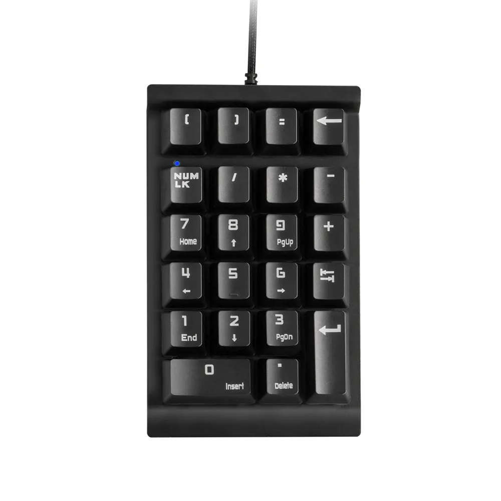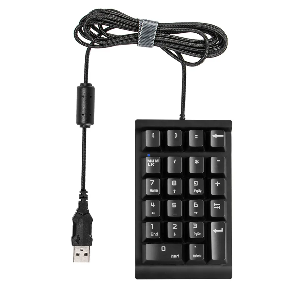 Sturdy braided cable, durable tensile effectively reduce the external resistance. Features 22 keys. There is also a single blue LED NumLock indicator.